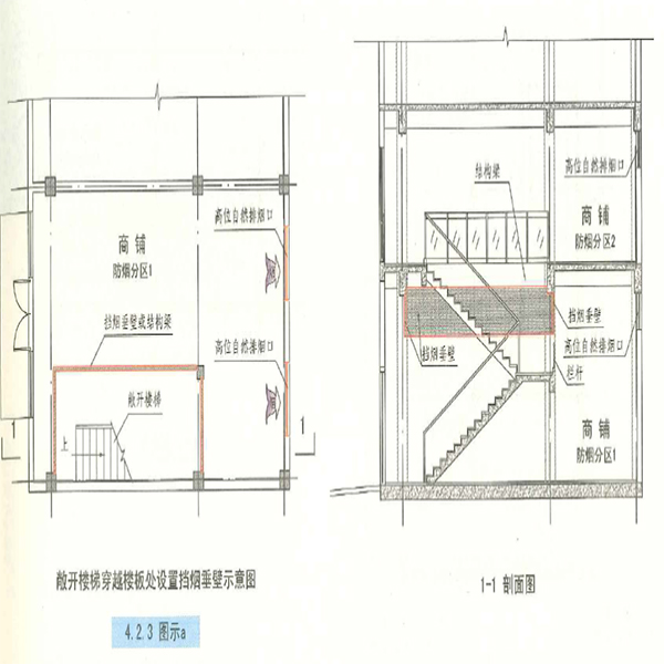 5. 《煙標(biāo)》423條:設(shè)置排煙設(shè)施的建筑內(nèi),敞開樓梯和自動扶梯穿越樓板的開口部應(yīng)設(shè)置擋煙垂壁等設(shè)施。(個人注:主要指開口部位,上下同一防火分區(qū)也要設(shè)擋煙垂壁。)《煙標(biāo)圖示》: