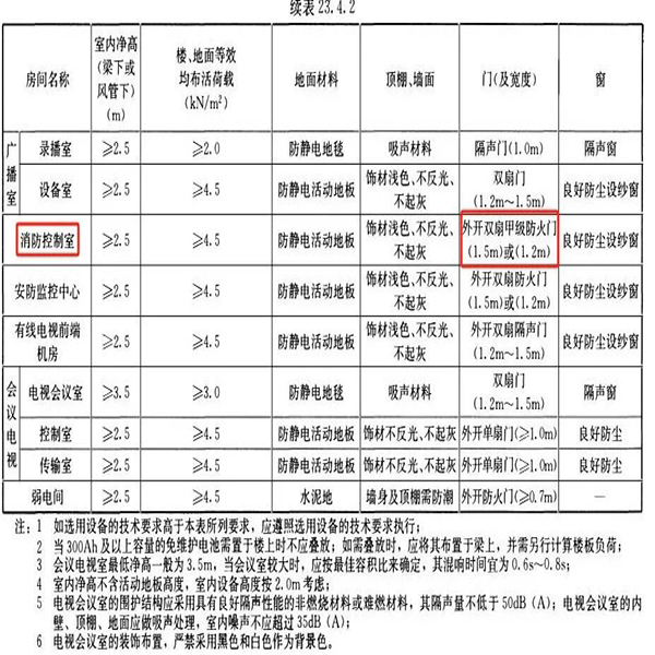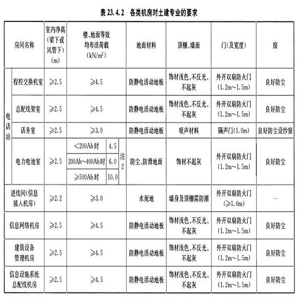 1各類機房的室內凈高、荷載及地面、門窗等要求,應符合表23.4.2的規(guī)定