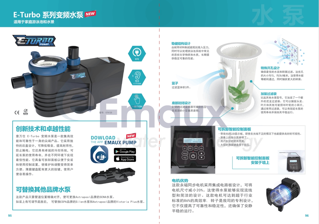 競(jìng)技池意萬(wàn)仕 E-Turbo 變頻水泵是一款集高效能和可靠性于一身的尖端產(chǎn)品。它采用獨(dú)特的后蓋設(shè)計(jì),可降低噪音,提高耐用性,防止觸電。它還具有卓越的冷卻系統(tǒng),可延長(zhǎng)泵的使用壽命,并在不同環(huán)境下實(shí)現(xiàn)最佳性能。它具備可拆卸面板以便于安裝和使用控制裝置,使維護(hù)和調(diào)整變得簡(jiǎn)單方便。薄膜鍵盤配有更大的按鍵,使用戶便容易操作。