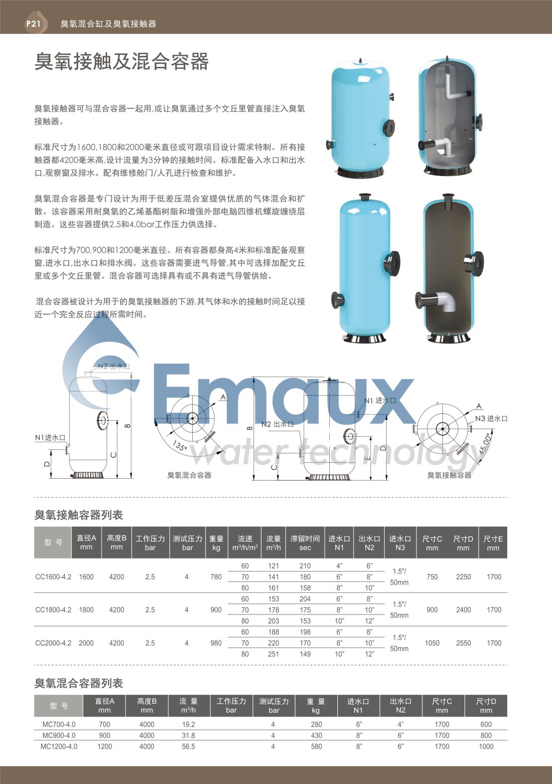 混合容器被設(shè)計(jì)為用千的臭氧接觸器的下游,其氣體和水的接觸時(shí)間足以接近一個(gè)完全反應(yīng)過(guò)程所需時(shí)間。