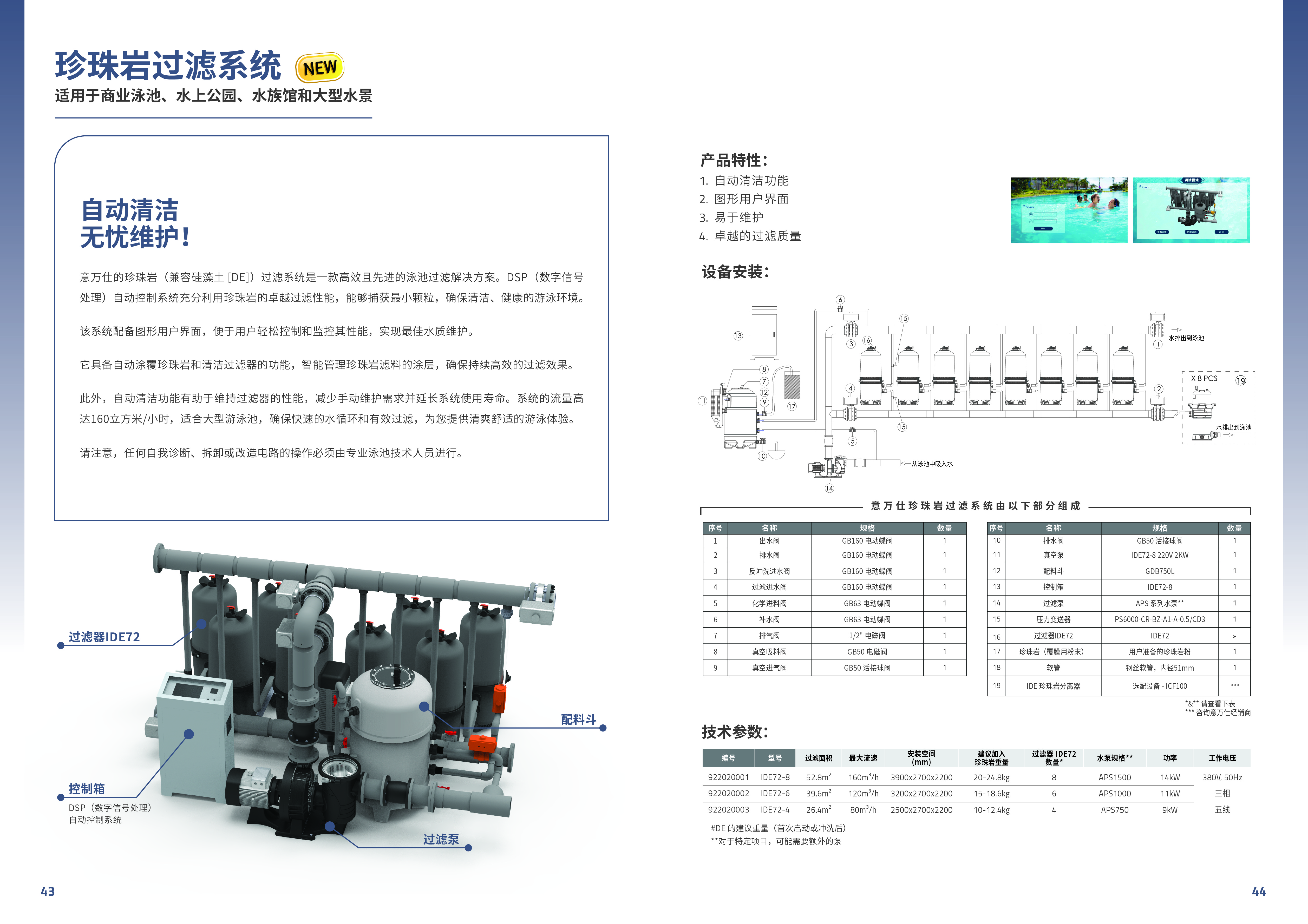 競技池意萬仕的珍珠巖(兼容硅藻土 [DE])過濾系統(tǒng)是一款高效且先進的泳池過濾解決方案。DSP(數(shù)字信號 處理)自動控制系統(tǒng)充分利用珍珠巖的卓越過濾性能,能夠捕獲最小顆粒,確保清潔、健康的游泳環(huán)境。 該系統(tǒng)配備圖形用戶界面,便于用戶輕松控制和監(jiān)控其性能,實現(xiàn)最佳水質維護。 它具備自動涂覆珍珠巖和清潔過濾器的功能,智能管理珍珠巖濾料的涂層,確保持續(xù)高效的過濾效果。 此外,自動清潔功能有助于維持過濾器的性能,減少手動維護需求并延長系統(tǒng)使用壽命。系統(tǒng)的流量高 達160立方米/小時,適合大型游泳池,確??焖俚乃h(huán)和有效過濾,為您提供清爽舒適的游泳體驗。 請注意,任何自我診斷、拆卸或改造電路的操作必須由專業(yè)泳池技術人員進行。