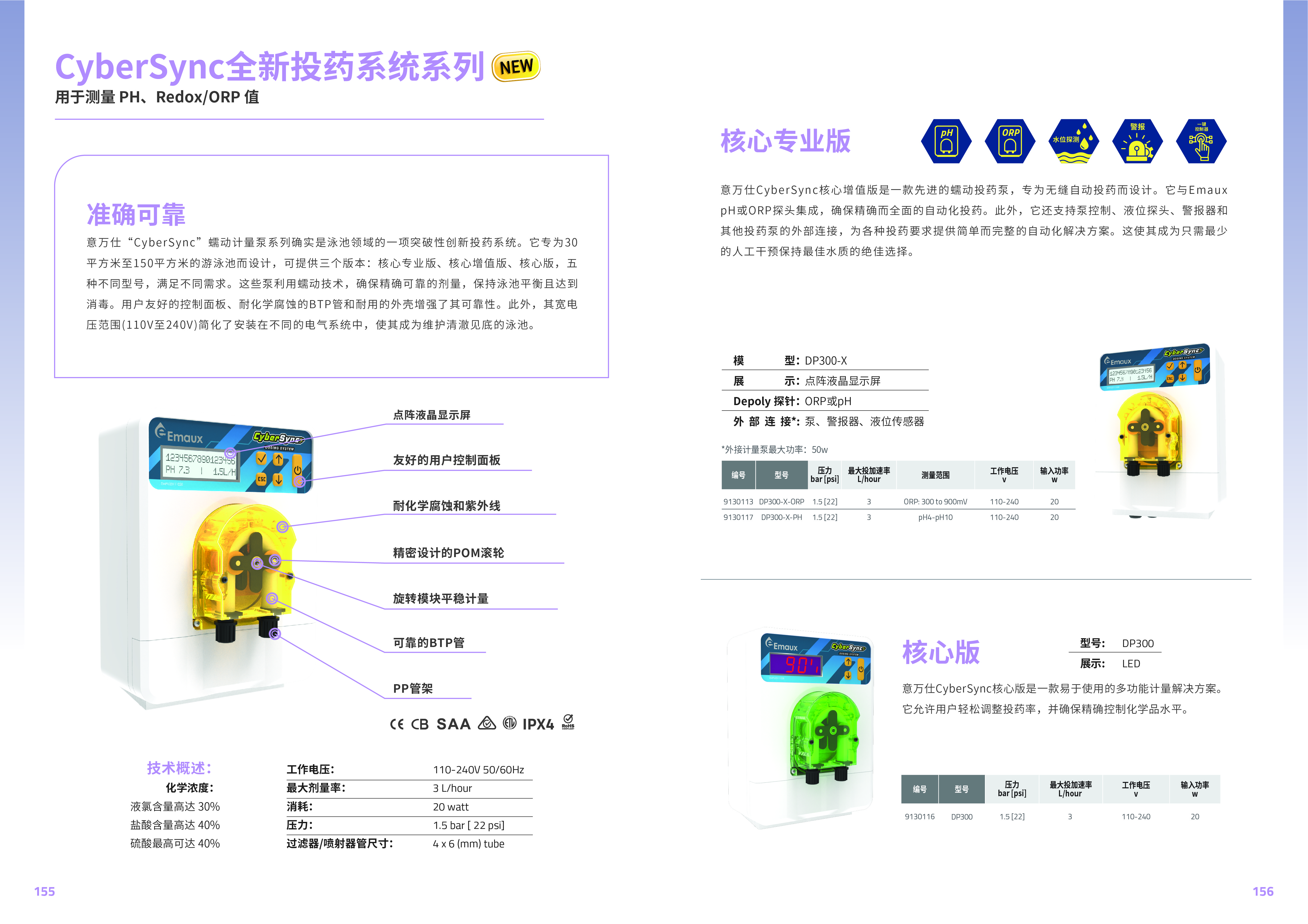 意萬(wàn)仕“CyberSync”蠕動(dòng)計(jì)量泵系列確實(shí)是泳池領(lǐng)域的一項(xiàng)突破性創(chuàng)新投藥系統(tǒng)。它專為30 平方?至150平方?的游泳池?設(shè)計(jì),可提供三個(gè)版本:核心專業(yè)版、核心增值版、核心版,五 種不同型號(hào),滿足不同需求。這些泵利用蠕動(dòng)技術(shù),確保精確可靠的劑量,保持泳池平衡且達(dá)到 消毒。用戶友好的控制?板、耐化學(xué)腐蝕的BTP管和耐用的外殼增強(qiáng)了其可靠性。此外,其寬電 壓范圍(110V至240V)簡(jiǎn)化了安裝在不同的電?系統(tǒng)中,使其成為維護(hù)清澈見底的泳池。