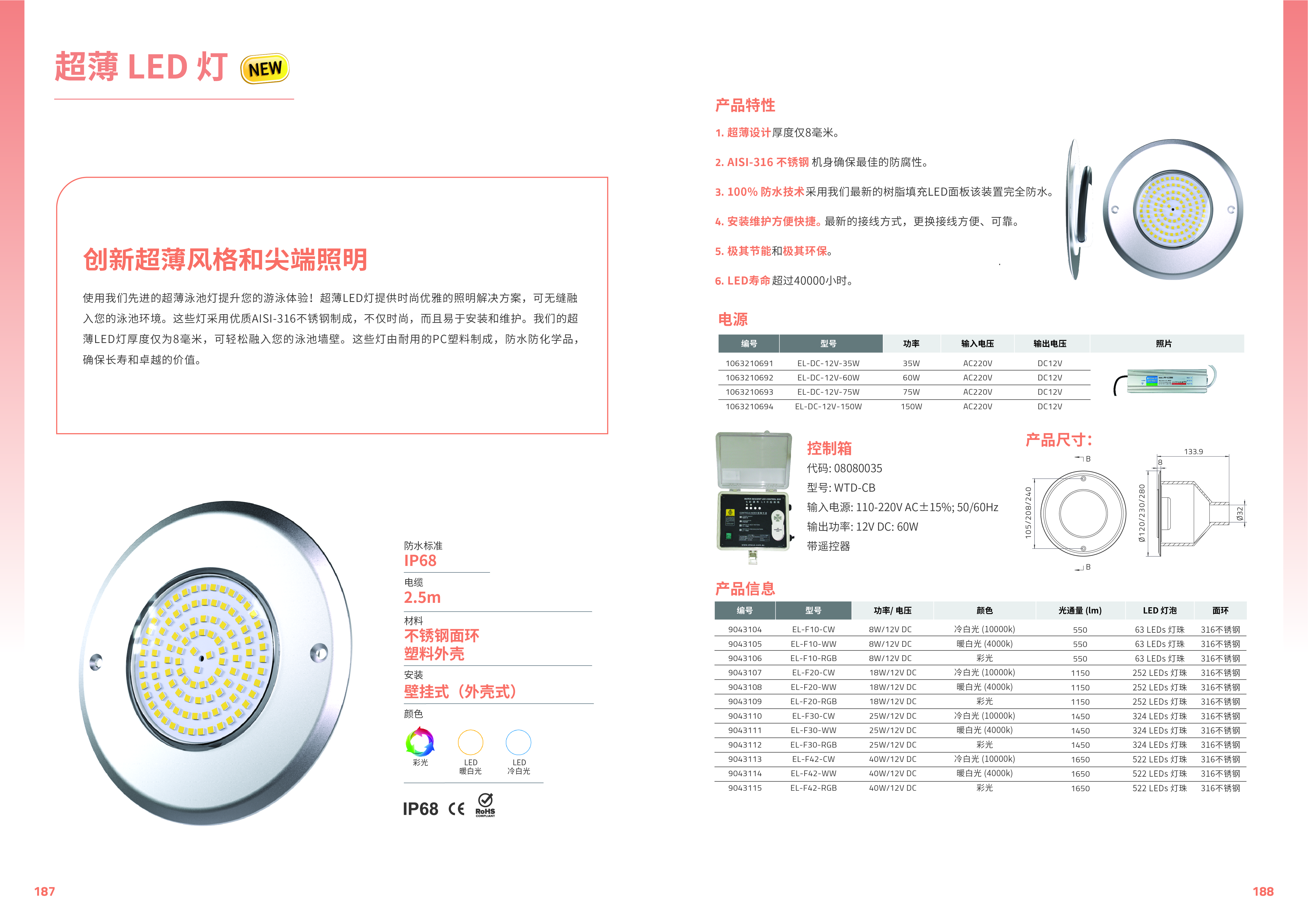 使用我們先進的超薄泳池?zé)籼嵘挠斡倔w驗!超薄LED燈提供時尚優(yōu)雅的照明解決方案,可?縫融 入您的泳池環(huán)境。這些燈采用優(yōu)質(zhì)AISI?316不銹鋼制成,不僅時尚,?且易于安裝和維護。我們的超 薄LED燈厚度僅為8毫?,可輕松融入您的泳池墻壁。這些燈由耐用的PC塑料制成,防水防化學(xué)品, 確保長壽和卓越的價值。