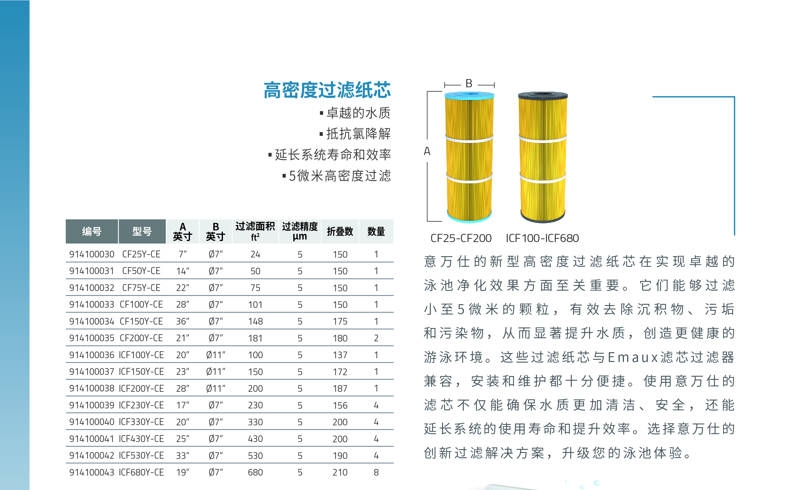 意萬仕的新型高密度過濾紙芯在實現(xiàn)卓越的 泳池凈化效果方面至關重要。它們能夠過濾 小至5微米的顆粒,有效去除沉積物、污垢 和污染物,從而顯著提升水質,創(chuàng)造更健康的 游泳環(huán)境。這些過濾紙芯與Emaux濾芯過濾器 兼容,安裝和維護都十分便捷。使用意萬仕的 濾芯不僅能確保水質更加清潔、安全,還能 延長系統(tǒng)的使用壽命和提升效率。選擇意萬仕的 創(chuàng)新過濾解決方案,升級您的泳池體驗。