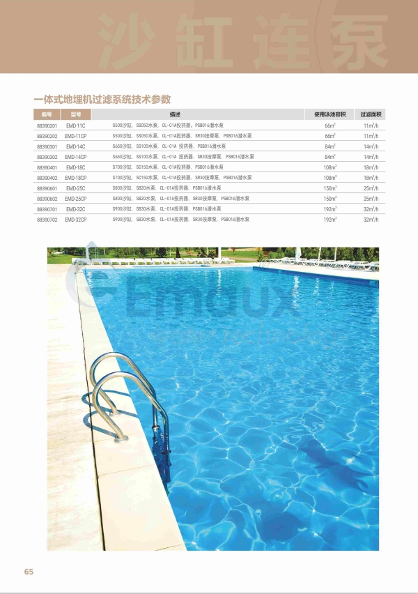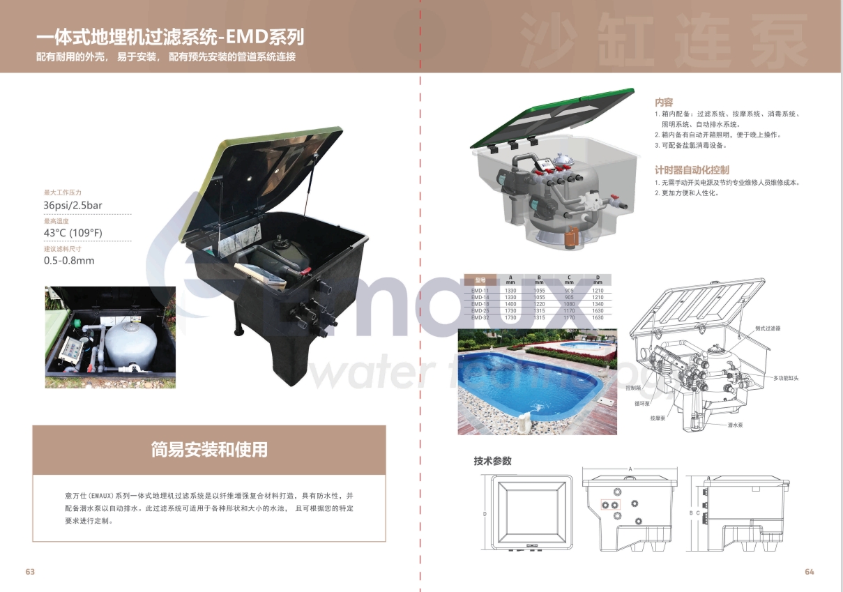 競(jìng)技池意萬(wàn)仕(EMAUX)系列一體式地埋機(jī)過(guò)濾系統(tǒng)是以纖維增強(qiáng)復(fù)合材料打造,具有防水性,并配備潛水泵以自動(dòng)排水。此過(guò)濾系統(tǒng)可適用于各種形狀和大小的水池, 且可根據(jù)您的特定要求進(jìn)行定制。