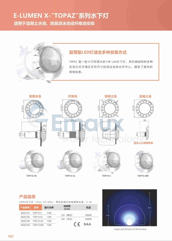 競技池TOPAZ 是一款小巧而強大的13W LED水下燈。其纖細結(jié)構(gòu)和多種安裝方式可滿足任何尺寸的游泳池和水療中心,提供了極好的照明效果。