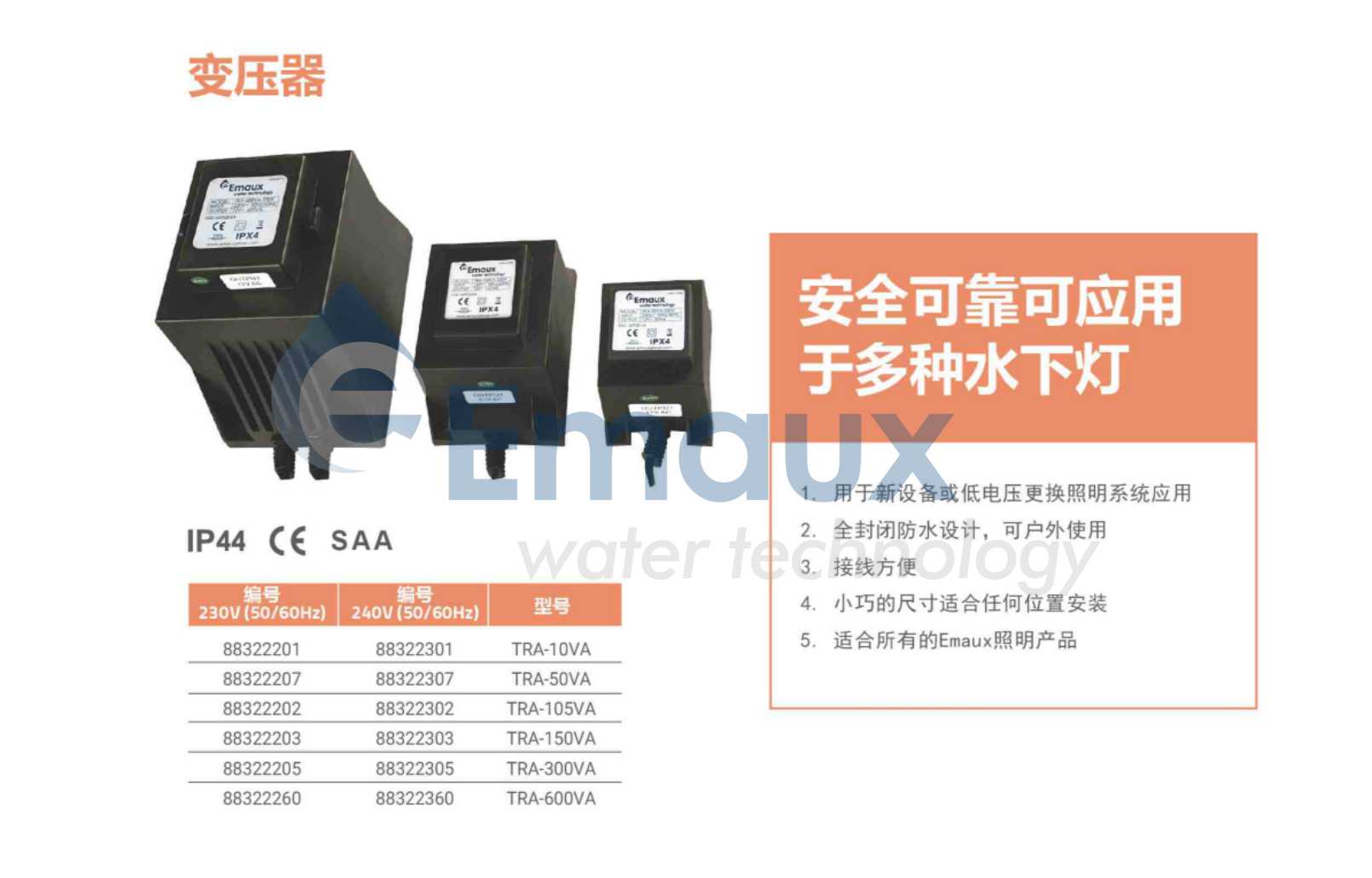 競(jìng)技池1. 用于新設(shè)備或低電壓更換照明系統(tǒng)應(yīng)用 2. 全封閉防水設(shè)計(jì),可戶外使用 3. 接線方便 4. 小巧的尺寸適合任何位置安裝 5. 適合所有的Emaux照明產(chǎn)品