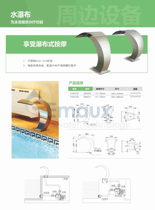 競(jìng)技池1. 不銹鋼AISl-316材質(zhì) 2. 地板預(yù)埋系統(tǒng)、配墊片和不銹鋼螺釘配件
