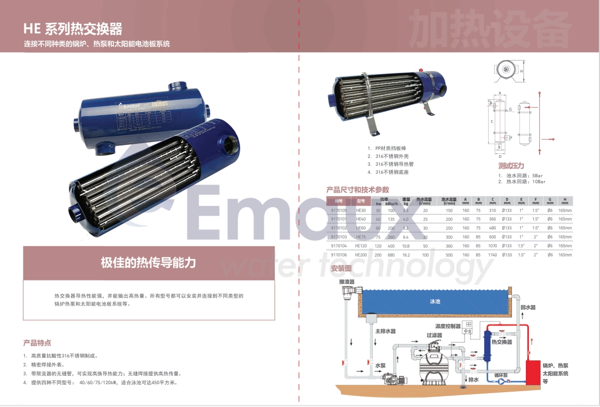 競技池熱交換器導(dǎo)熱性能強,并能輸出高熱量。所有型號都可以安裝并連接到不同類型的鍋爐熱泵和太陽能電池板系統(tǒng)等。