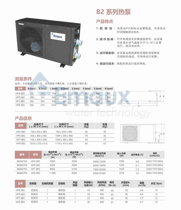 2. 操作簡單:打開電源設(shè)定所需溫度即可。此設(shè)備可在室外空氣溫度介于12-35℃正常運行,給泳池加熱。