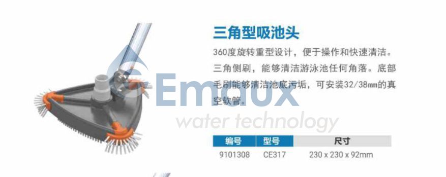 競技池360度旋轉(zhuǎn)重型設(shè)計(jì),便于操作和快速清潔。三角側(cè)刷,能夠清潔游泳池任何角落。底部毛刷能夠清潔池底污垢,可安裝32/38mm的真空軟管。