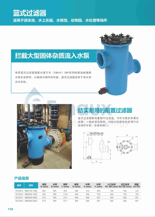 競技池商用籃式過濾器是配合意萬仕(EMAUX)SWP系列耐腐蝕玻璃鋼水泵安裝使用,以確保水循環(huán)的性能。籃式過濾器適用于海水和淡水系統(tǒng)。