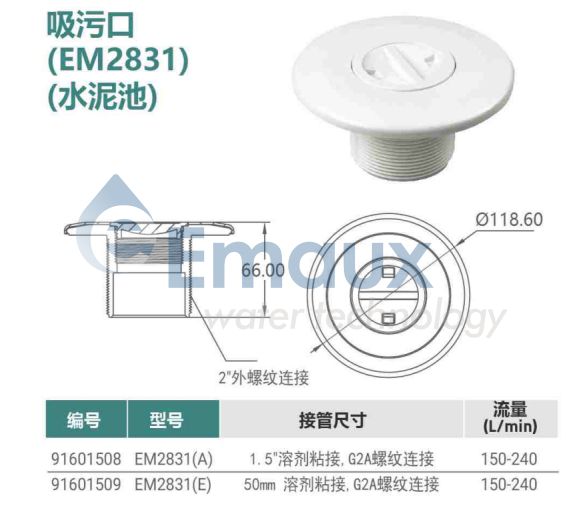 您的位置:首頁>產(chǎn)品概覽>吸污口配件>吸污口 (EM2831) 水泥池