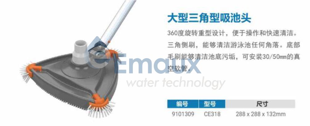 競技池360度旋轉(zhuǎn)重型設(shè)計(jì),便于操作和快速清潔。三角側(cè)刷,能夠清潔游泳池任何角落。底部毛刷能夠清潔池底污垢,可安裝30/50mm的真空軟管。