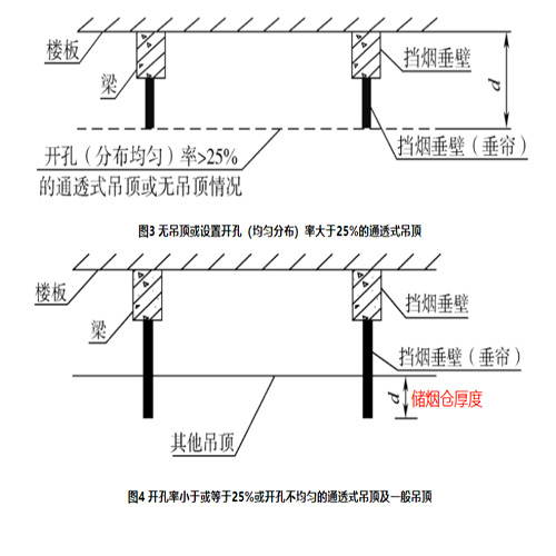 2.擋煙垂壁等擋煙分隔設(shè)施的深度≥規(guī)定的儲煙倉厚度。對于有吊頂?shù)目臻g,當(dāng)?shù)蹴旈_孔不均勻或開孔率≤25%時,吊頂內(nèi)空間高度不得計(jì)入儲煙倉厚度。