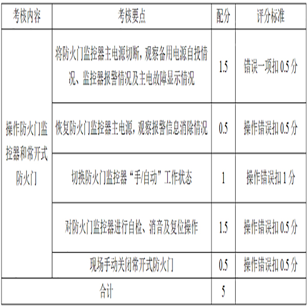 防火門操作考核內(nèi)容防火門的操作方法??己藰?biāo)準(zhǔn)1.正確對(duì)防火門監(jiān)控器主電和備電自動(dòng)切換功能進(jìn)行測試; 2.正確排除電源的故障狀態(tài); 3.正確判斷并切換防火門監(jiān)控器的手動(dòng)/自動(dòng)控制狀態(tài); 4.正確對(duì)防火門監(jiān)控器進(jìn)行自檢、消音及復(fù)位操作; 5.正確現(xiàn)場手動(dòng)關(guān)閉常開式防火門并查看信號(hào)反饋情況。 考核方式模擬操作或現(xiàn)場操作。